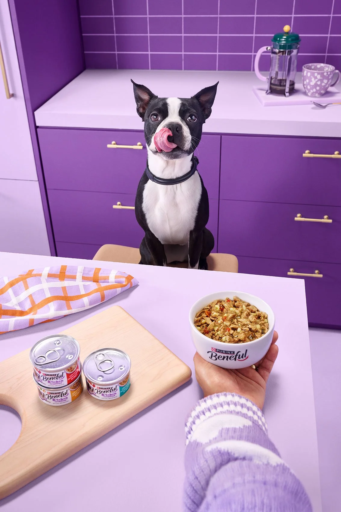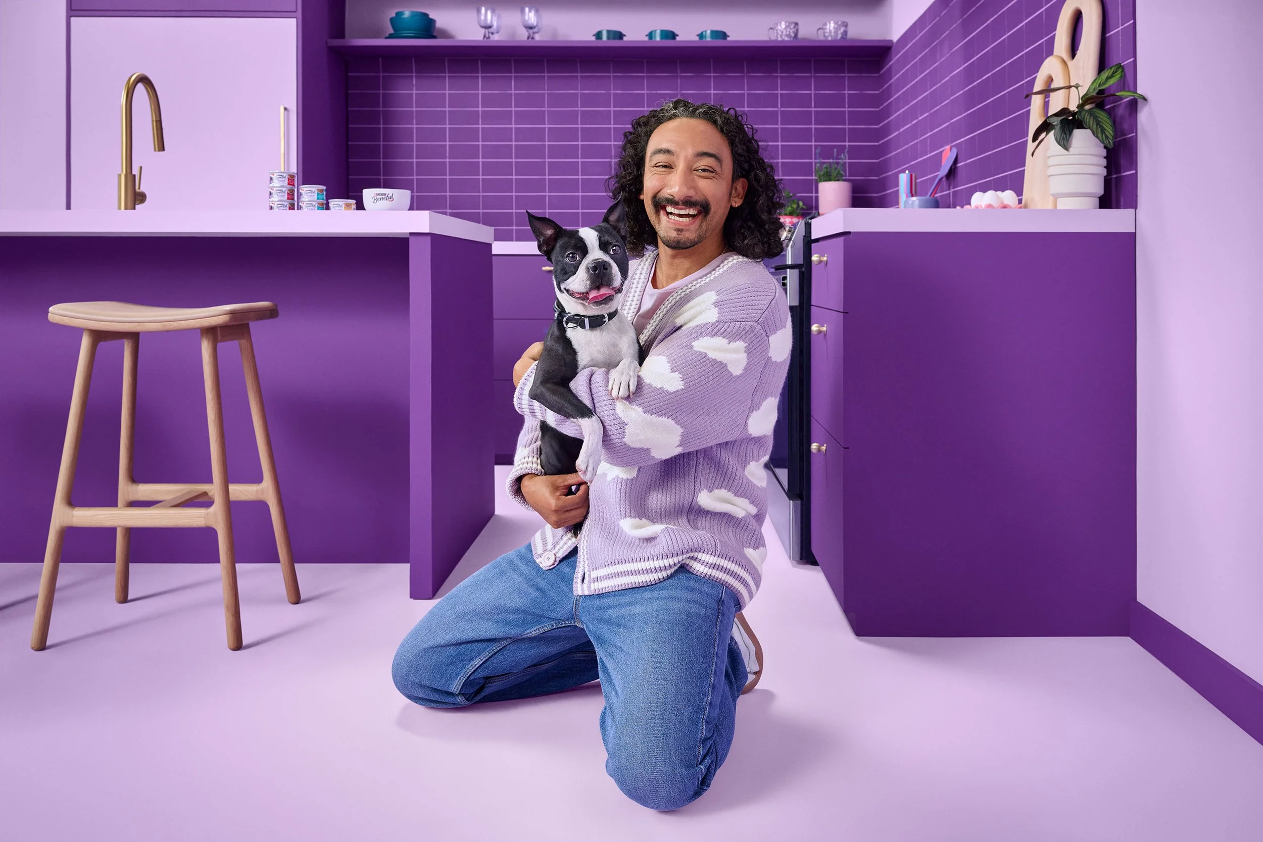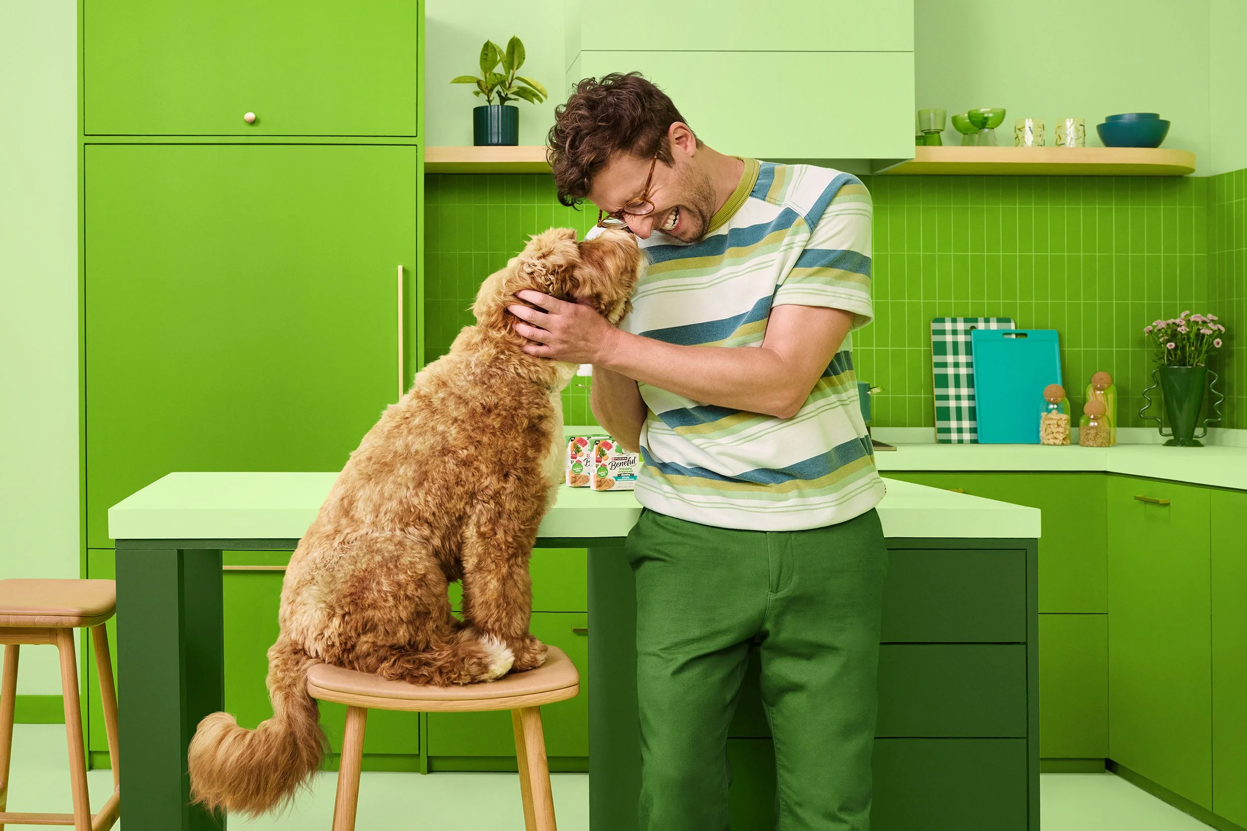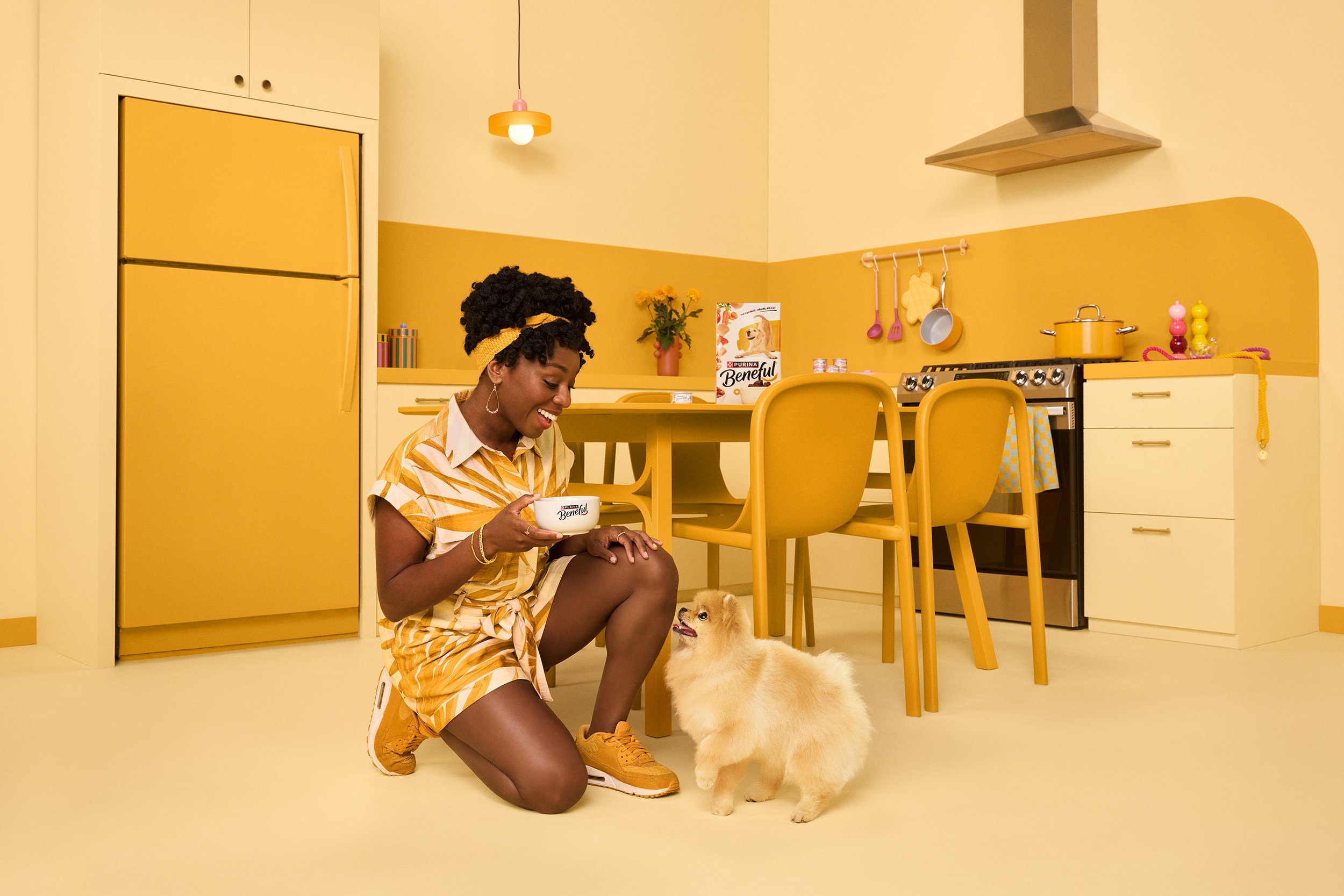“Imagine, if you will, this huge space and it’s like Pee Wee’s Playhouse,” says Annabelle. There were four monochromatic kitchen sets, each keyed to a bright Beneful brand color. Randal would finish shooting on a set, and then a team would come in and paint and reconfigure it for the next round of images. (So, four sets, but really eight sets.)