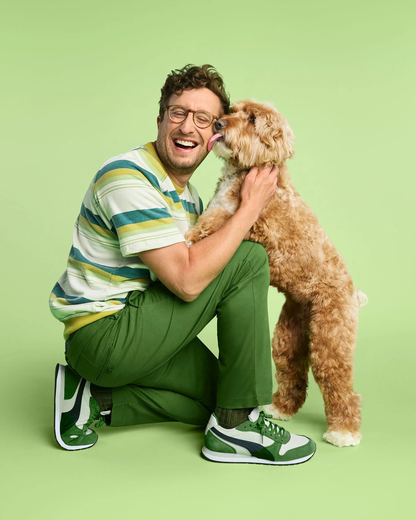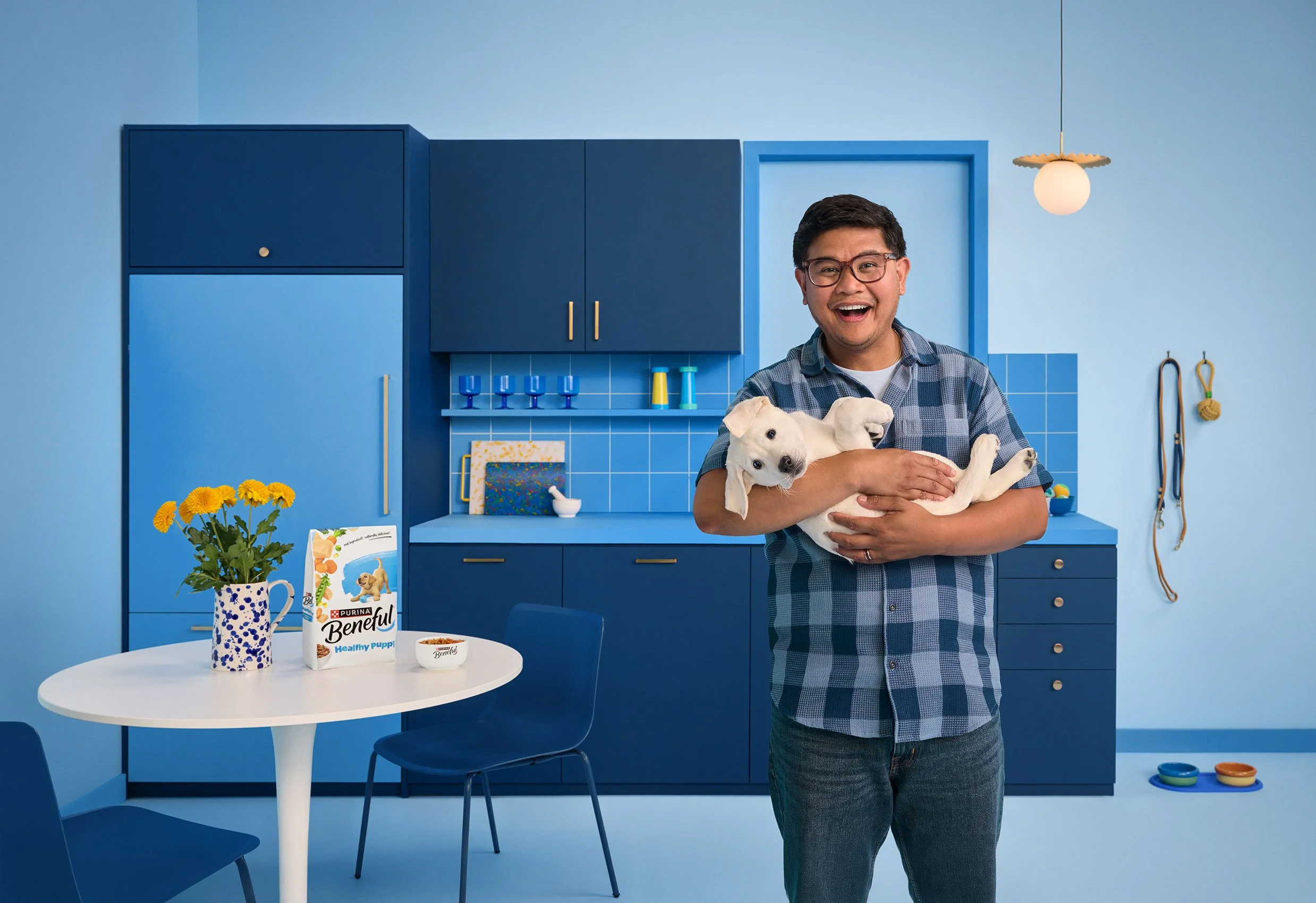 Puppies, dancing, laughter—these are just a few of the highlights of Randal Ford and Annabelle Breakey’s colorful collaboration for Purina’s Beneful brand. Working in a massive studio in Los Angeles over four shoot days, the two photographers produced a vast image library that spanned product still lifes and hands with product (by Annabelle) and pet portraits and adorable pet/owner interactions (courtesy of Randal).